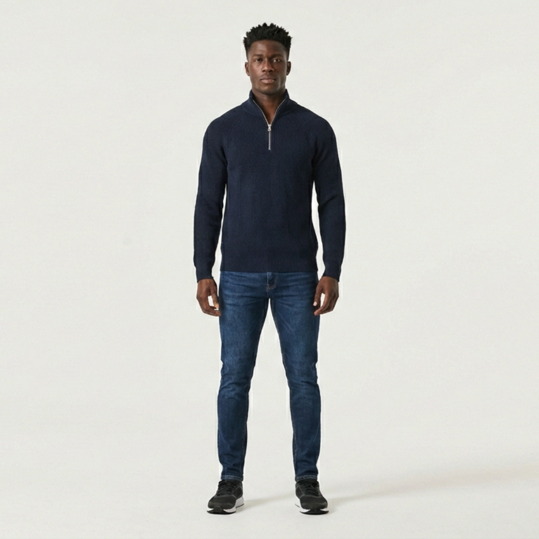 Cierre: Sistema de media cremallera ( Quarter-Zip ) con herraje metálico reforzado y tirador circular minimalista.